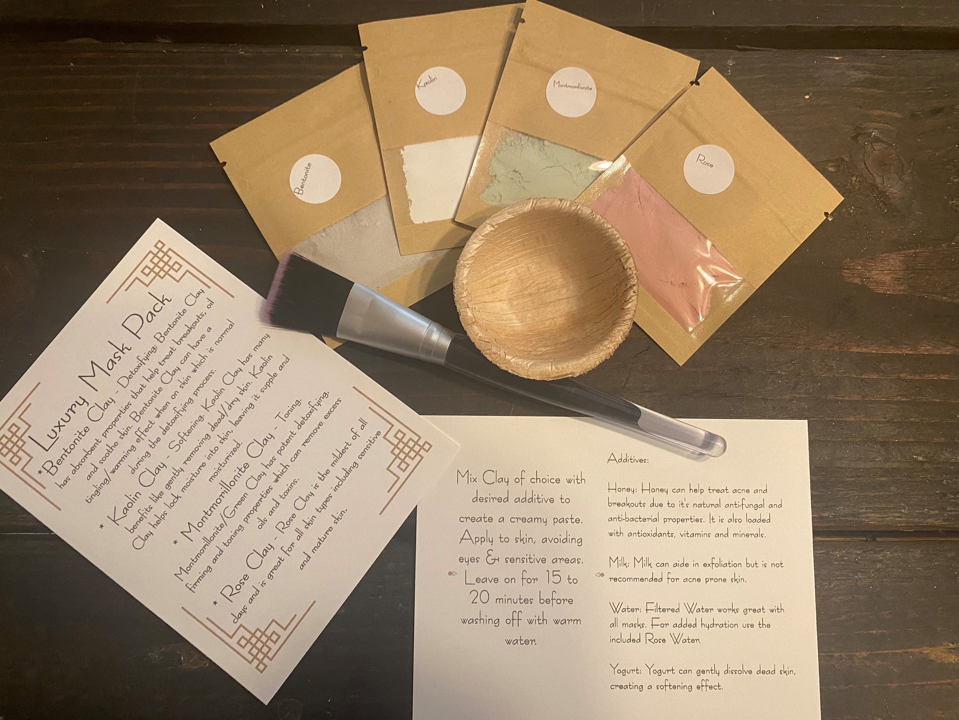 Our Luxury Mask Packs include 4 different kinds of organic clays. Clay Masks can help brighten, detoxify, firm, hydrate and smooth skin. Our clays are 100% natural. Luxury Mask Packs include Bentonite Clay, Kaolin Clay, Montmorillonite Clay and Rose Clay. The order will also include a brush, mini bamboo mixing bowl and rose water. Each clay has several different benefits so depending on your skin concerns at the time or as they may change you will surely find one of the clays will address your concern.