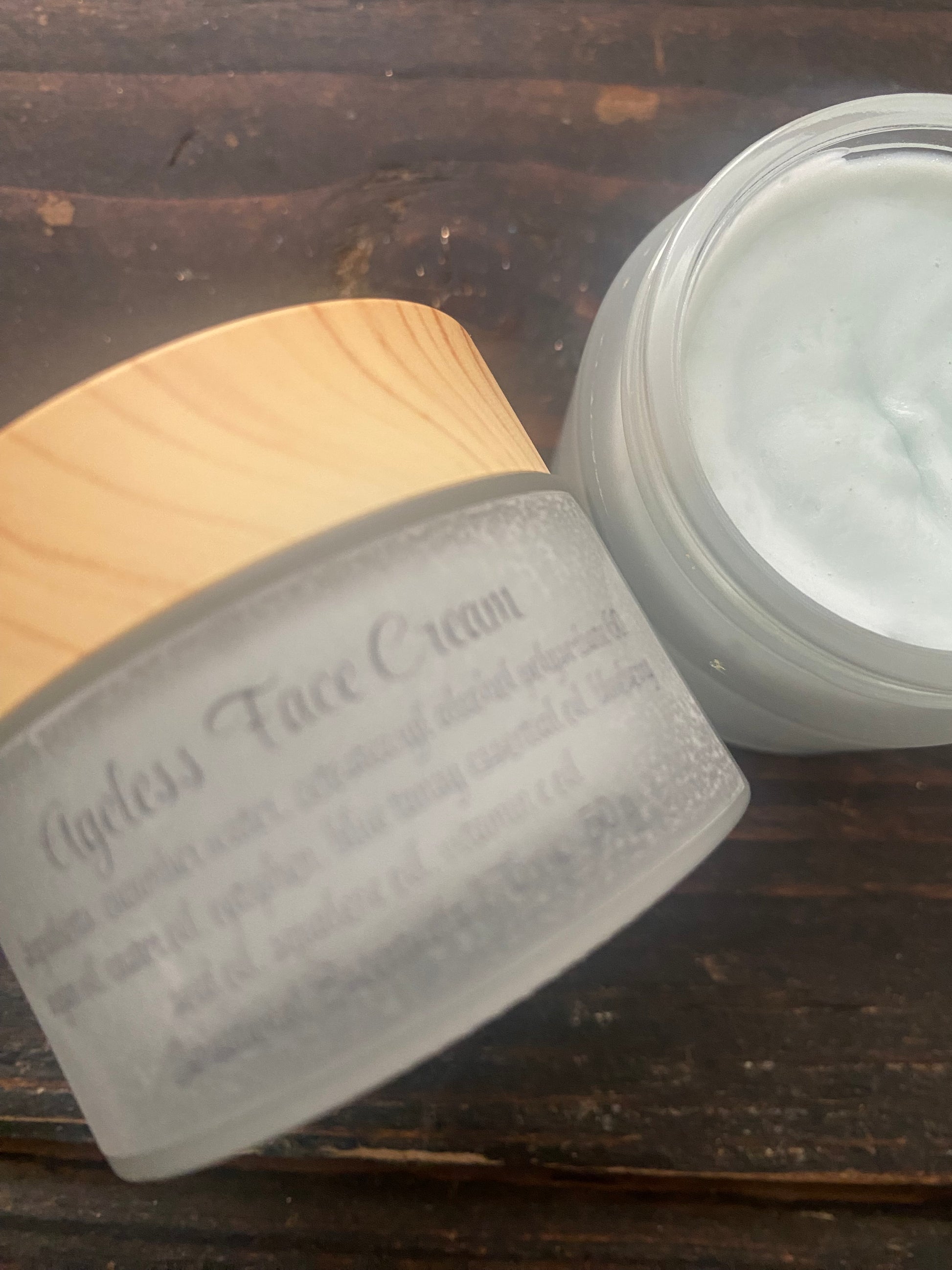 As we age our bodies produce less and less of the things we need to keep our appearance youthful, which is why the Ageless Face Cream is loaded with collagen, hyaluronic acid, vitamin a, vitamin c, niacinamide and blue tansy oil.